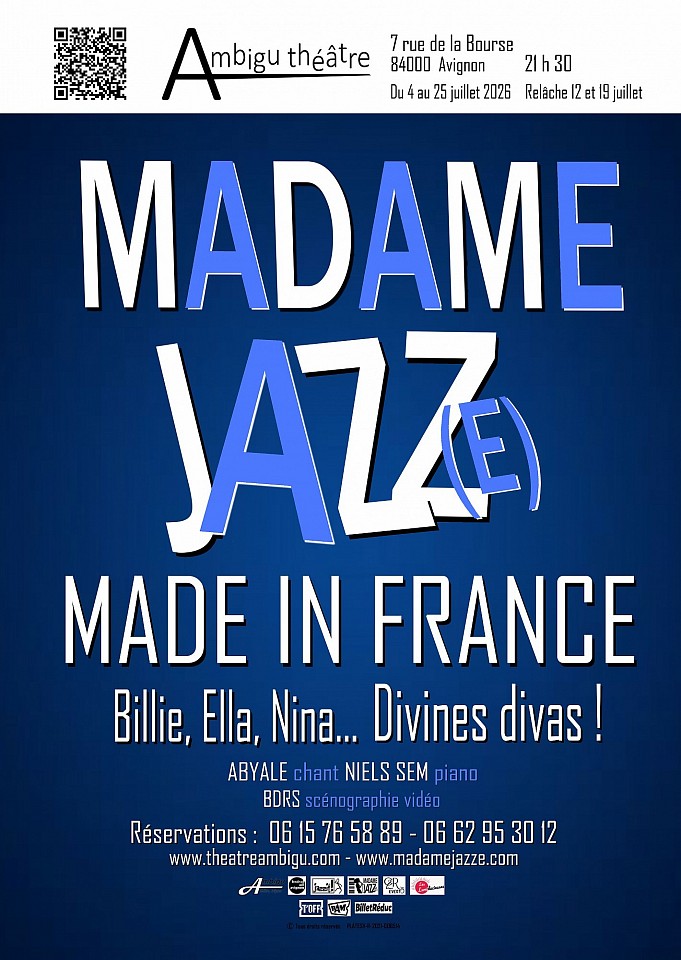Après les Festival OFF Avignon 2024 et Festival de Jazz de l'Hôtel de Caumont à Aix-En-Provence COMPLETS, après un succès de de 4 mois à Paris au théâtre de La scène Libre ( Jean-Marc Dumontet Production) et au théâtre Montmarte Galabru, Madame Jazz(e) revient dès Septembre au TMG au coeur de Montmartre après un Festival Off Avignon 2025 COMPLET !